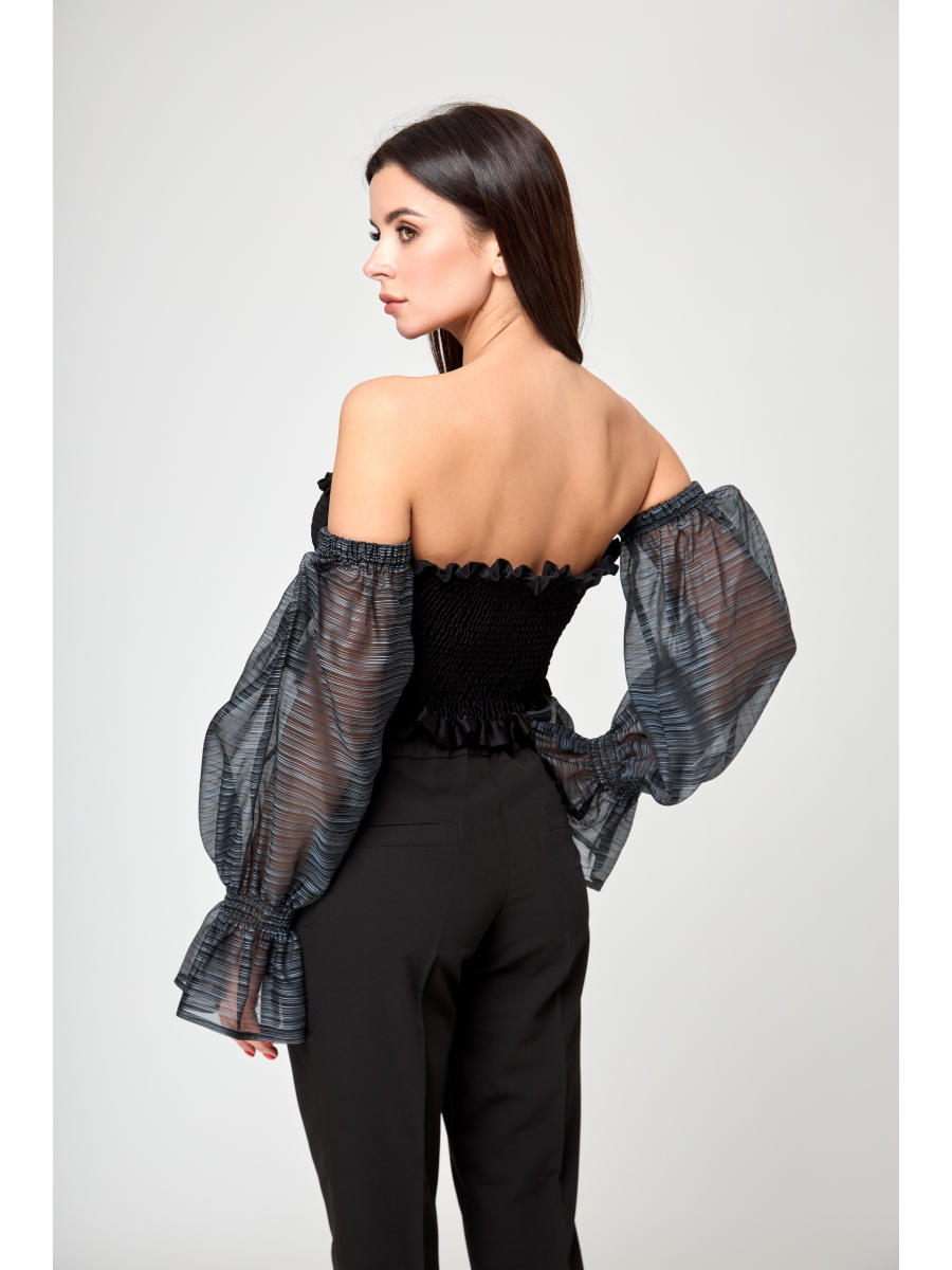 Топ с прилегающим лифом, полностью собранный на ликру прекрасно сядет на любую фигуру.