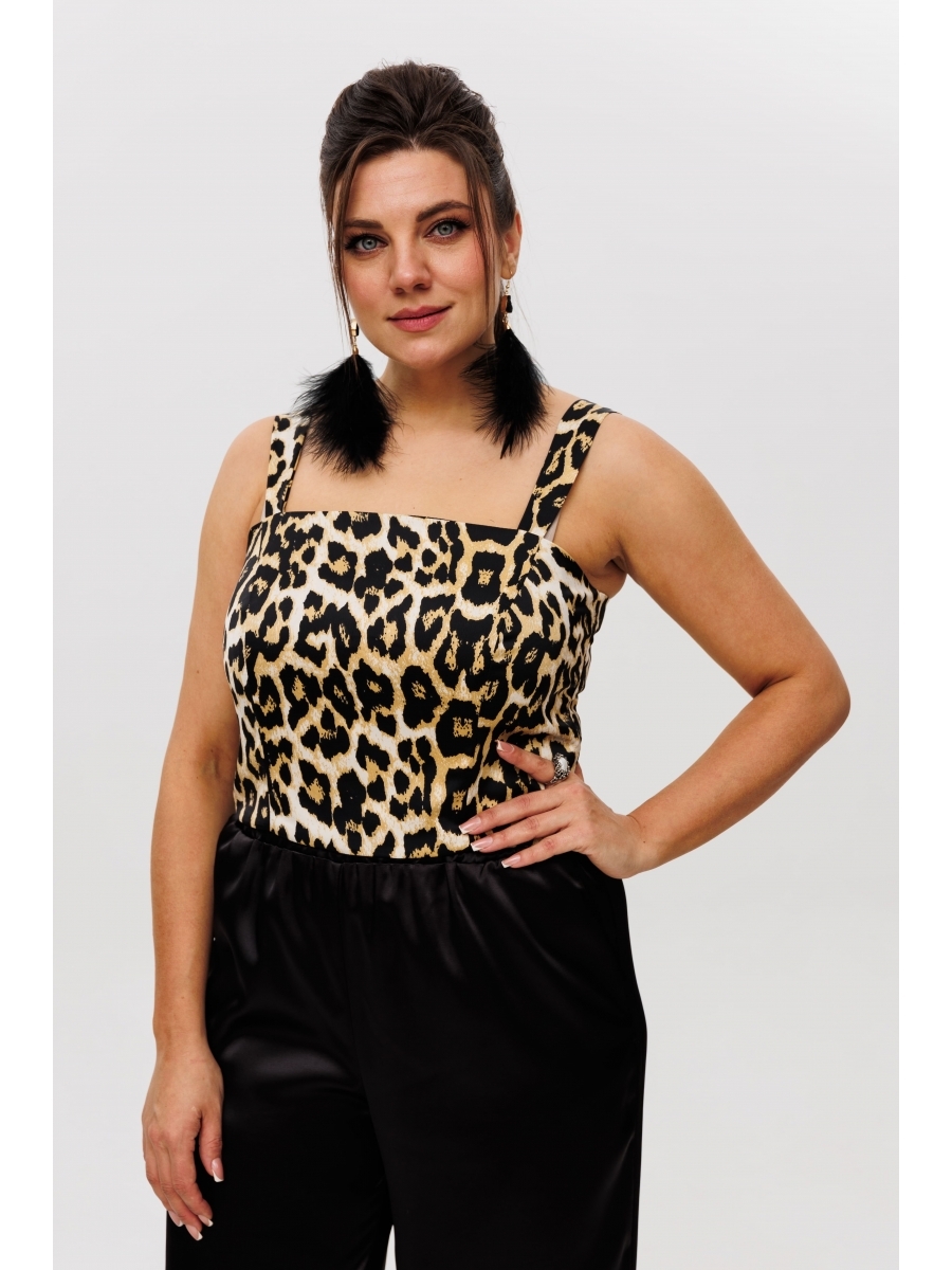 На модели в топ цвета «лео» юбка 1291, брюки 1425.1, черная рубашка 1203 и болеро 1445.