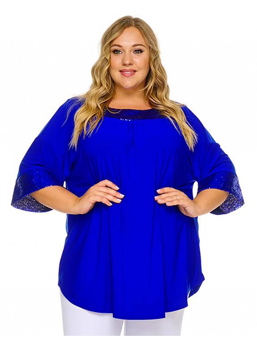 Стильная туника из трикотажа свободного силуэта. Горловина на закругленной кокетке, отделана пайетками. По центру спинки из-под кокетки - встречная складка. Линия плеча спущенна, рукав расширенный, заканчивающийся свободным манжетом из пайеток.