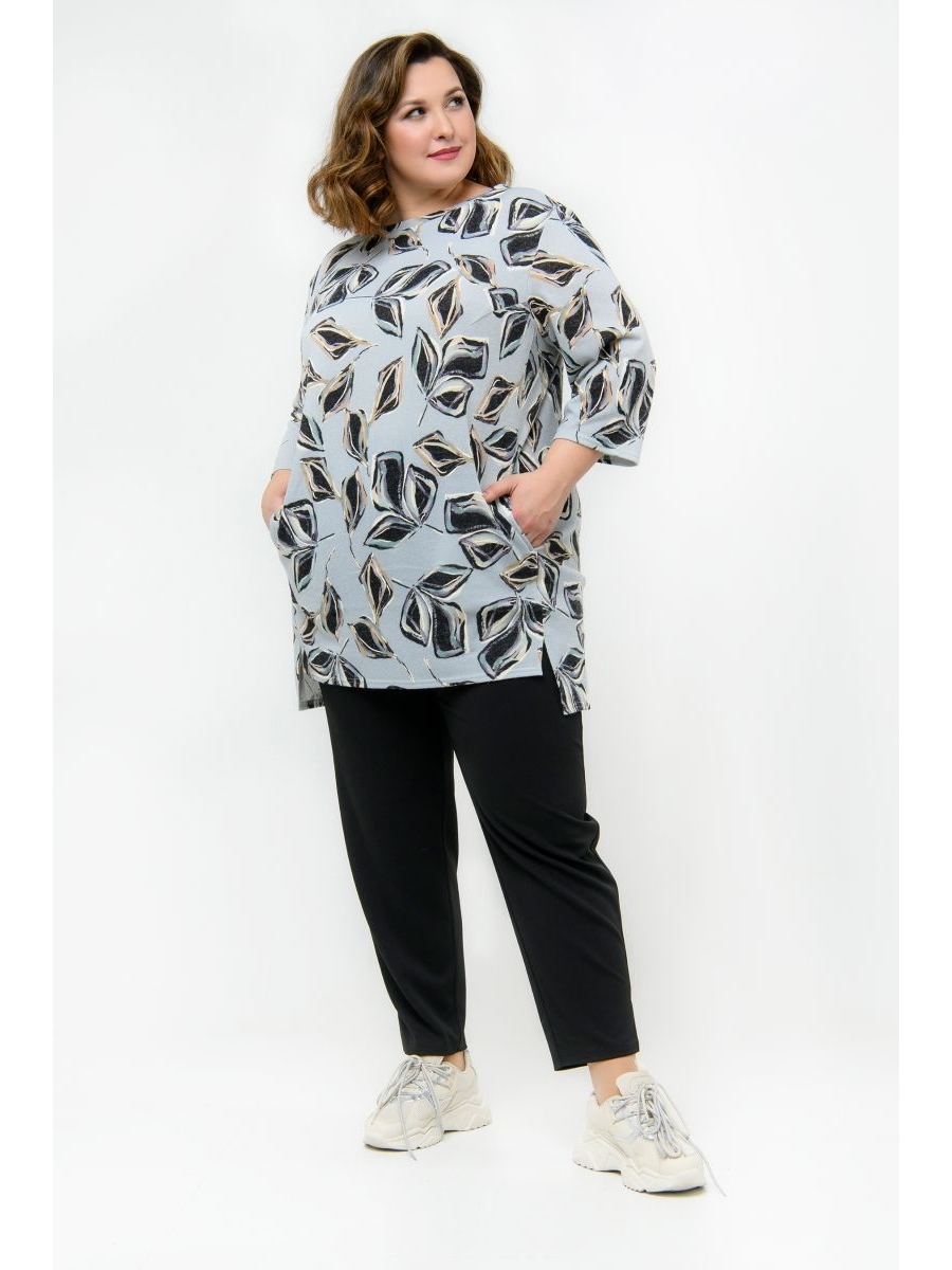 Туника прямого силуэта из джерси. Уникальность конструкции туники в отсутствии боковых швов. Спинка переходит в переднюю часть на уровне вертикальных рельефных швов, зрительно вытягивающих силуэт. В этих швах обработаны карманы и разрезы. Передняя часть короче задней на 6 см. Удобный свободный рукав. Идеально сочетается с джинсами и зауженными брючками.