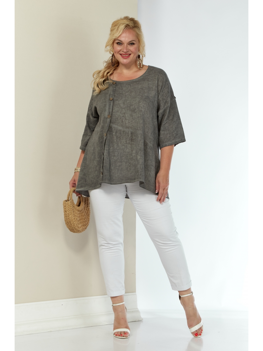 Женская льняная туника выполнена из высококачественного умягченного 100% натурального льна. Лён прошёл процедуру энзимного умягчения на производстве, поэтому туника не колется и не садится после стирки. Модель свободного силуэта к низу расширена, за счет подреза и легкой сборки по полочке. Вырез горловины округлой формы. По переду смещенная планка, декорированная пуговицами. Рукав трансформер, со спущенной линией плеча, регулируется при помощи паты и пуговицы. Спинка со средним швом. Низ изделия фигурный.