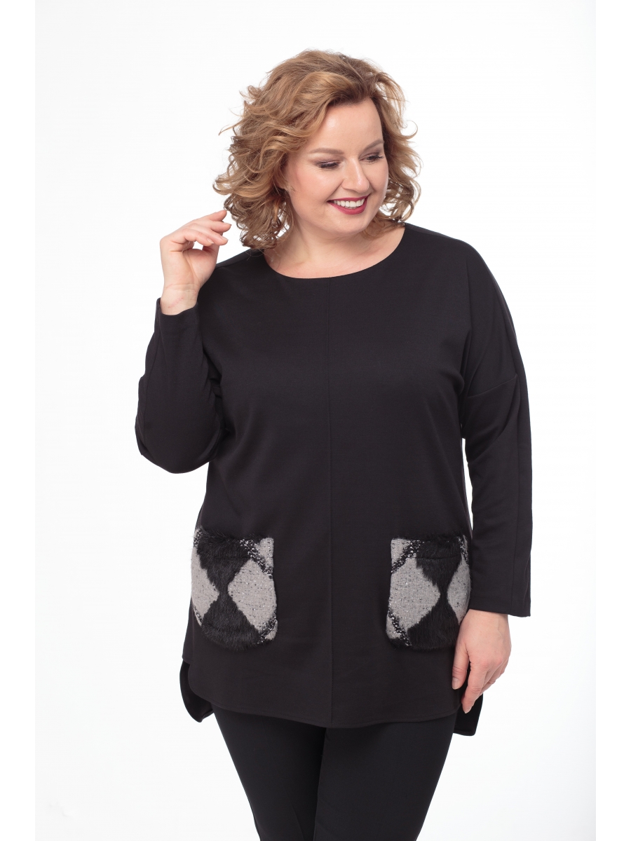 Туника-блузон женская с меховыми карманчиками черных тонов.