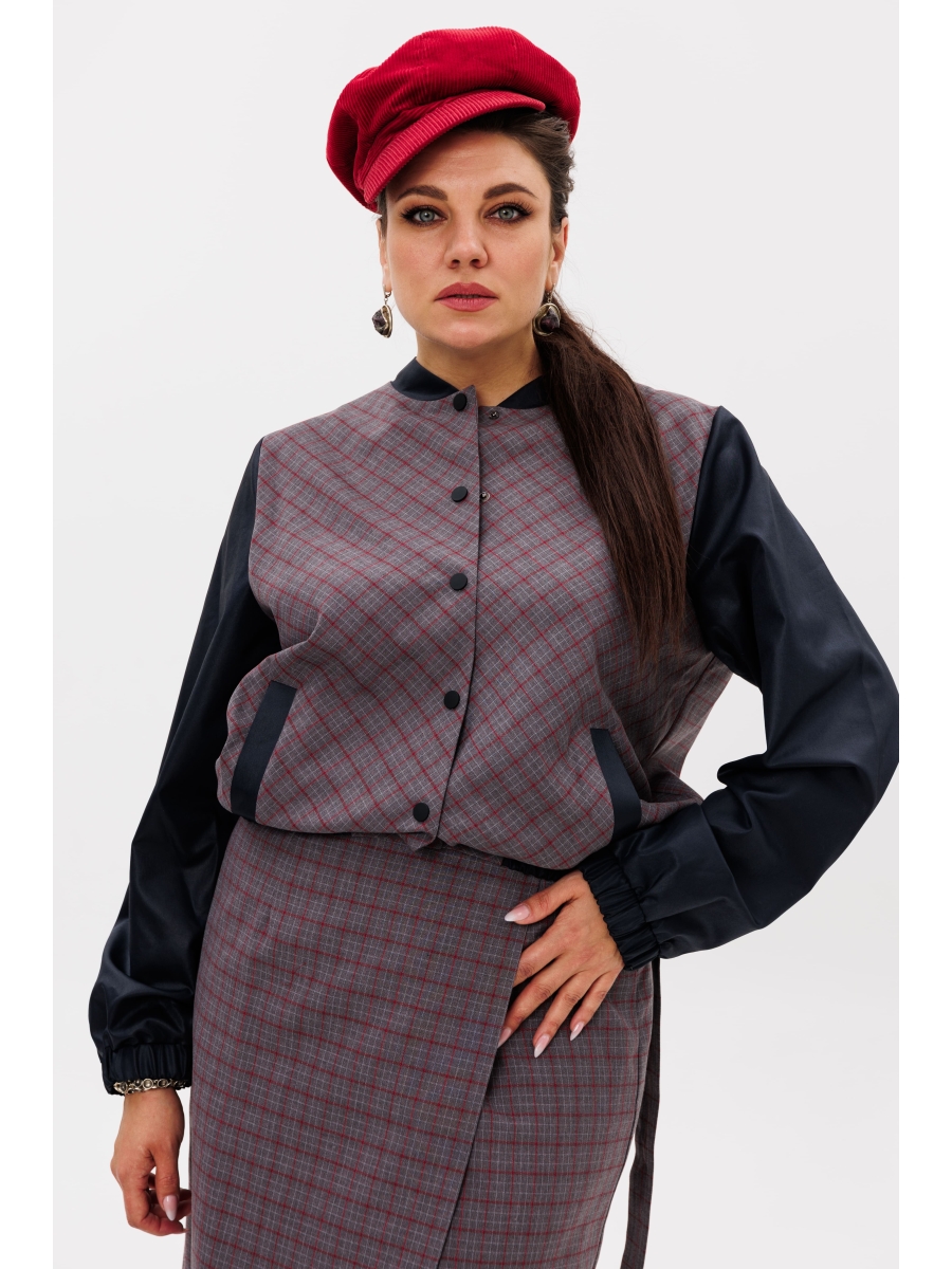 Бомбер выполнен из костюмной ткани в сочетании с тканью с напылением под кожу. Силуэт прямой, с застежкой на кнопки по всей длине.