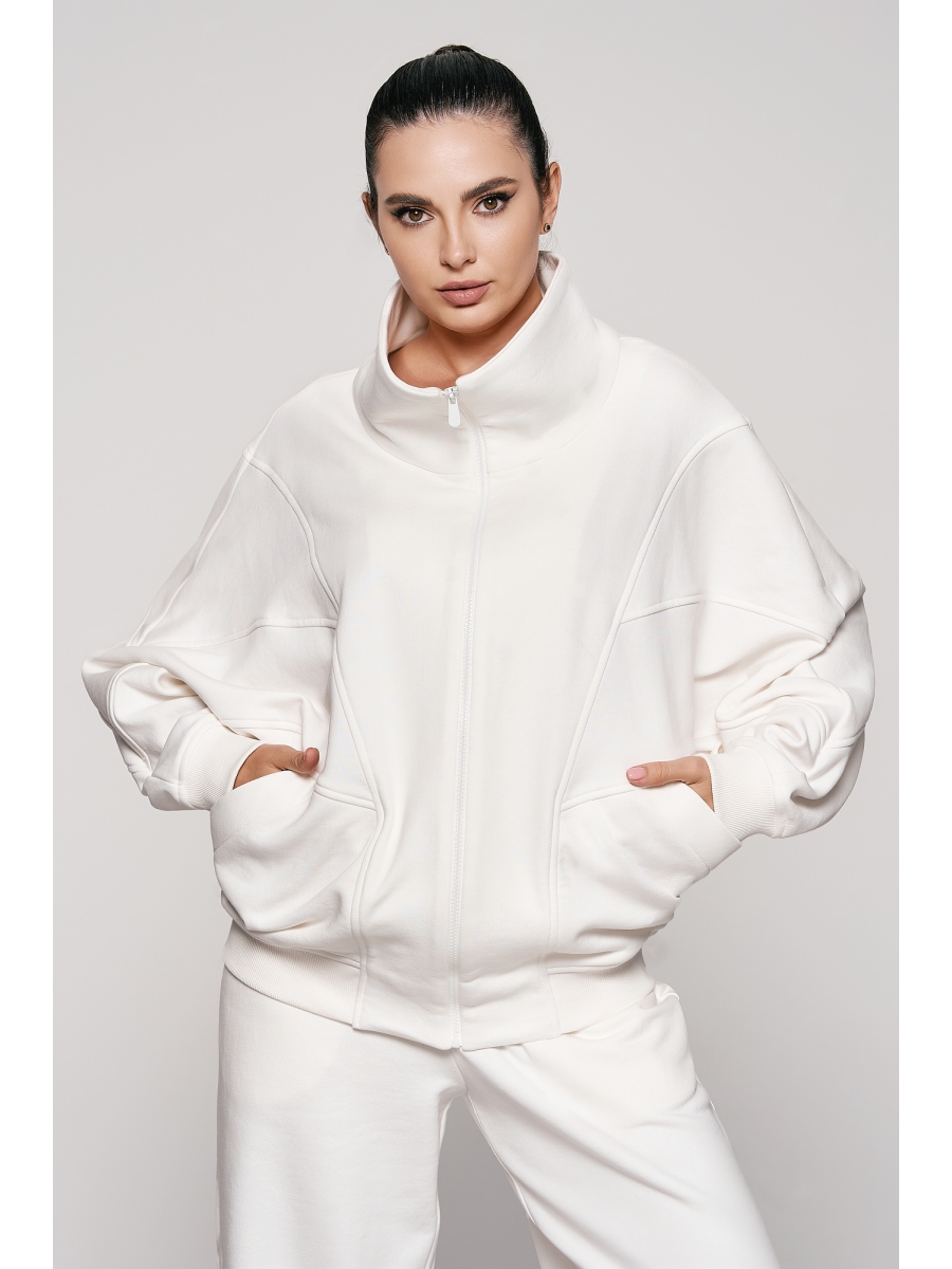 Спортивный женский бомбер свободного силуэта с рукавами "летучая мышь" и функциональными карманами по переду застегивается на молнию. Бомбер выполнен из высококачественного футера 3-х нитки класса "пенье". Лицевая сторона ткани гладная, изнанка - петлеобразная. Низ бомбера и рукавов выполнены из трикотажного полотна в рубчик (резинка) "кашкорсе" в тон основной ткани.