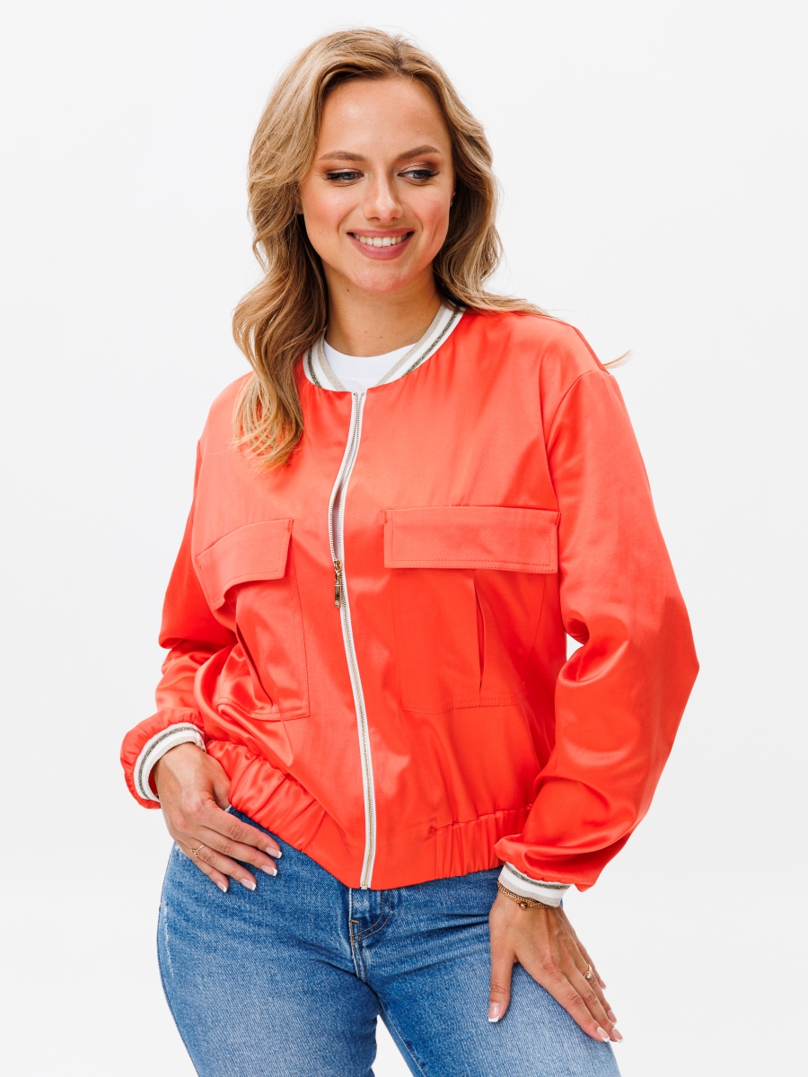 Бомбер прямого силуэта со слегка спущенным плечом из хлопковой ткани сатин, собран на резинку понизу. По переду настрочены карманы с встречной складкой и клапаном. Застежка на молнию по переду. Горловина обработана довязом. Рукав втачной одношовный собранный понизу на довяз.