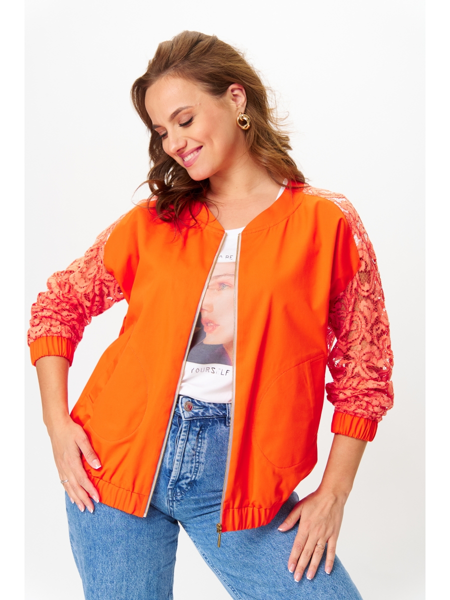 Комплект женский состоит из бомбера и футболки .Бомбер женский скомбинирован из текстиля гипюра , отлично подойдет для торжественных случаев и так же для летних прогулок . Застежка центральная на металлическую молнию . Спереди прорезные карманы в рамку с втачной листочкой и отделочной строчкой по контуру мешковины .Футболка прямого кроя с втачными рукавом. По переду стойкая ,декоративная печать .