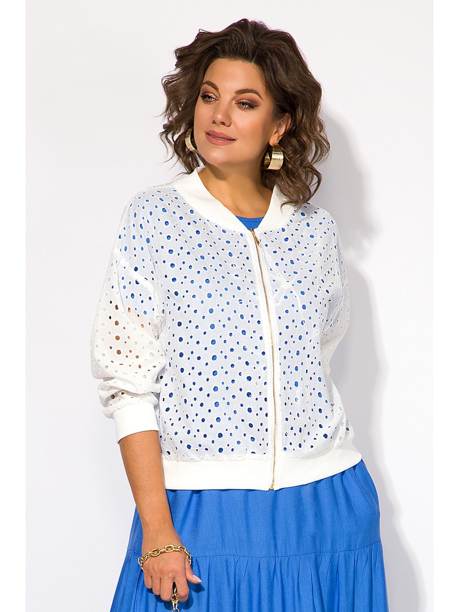 Облегченный жакет, по типу бомбера с застежкой на металлическую молнию, выполнен из хлопковой ткани с вышивкой ришелье. Рукав на спущенном плечевом поясе. Вырез горловины, низ изделия и рукавов оформлен мягкой притачной планкой из кашкорсе. Спинка без особенностей.
