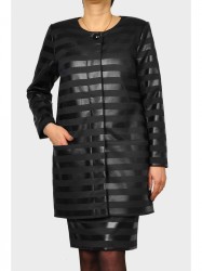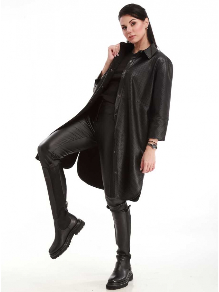 Кардиган женский прямого силуэта из экокожи, отрезной по талии. В боковых швах обработаны потайные карманы. По бокам разрезы округлой формы. Воротник рубашечный на стойке. По передней полочке застежка планка с металлическими кнопками. Рукав укороченный с манжетой. Длина рукава 3/4. Фактические замеры изделия.