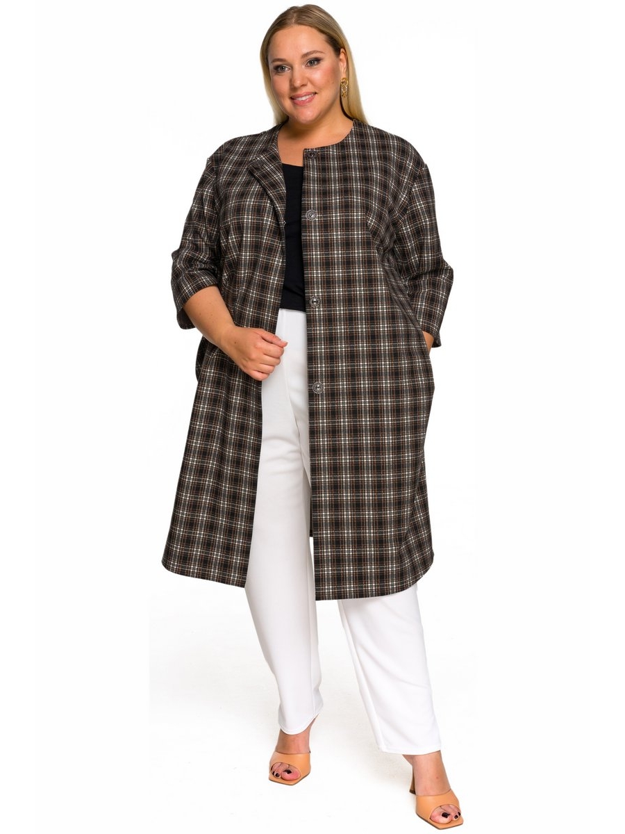 Кардиган - "летнее" пальто выполнен из трикотажного джерси. Ткань содержит вискозу и небольшой процент эластана. Модель прямого силуэта, с карманами в боковых швах, застегивается на 4 пришивные кнопки. Рукав 3/4.