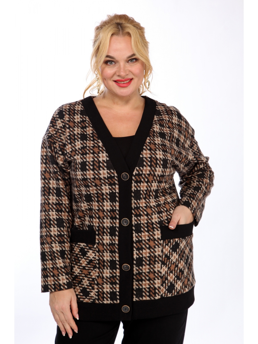 Кардиган женский прямого силуэта из трикотажного полотна, с центральной застежкой. По переду обработаны накладные карманы. Горловина V-образной формы. Рукав спущенный. Кардиган без подкладки.