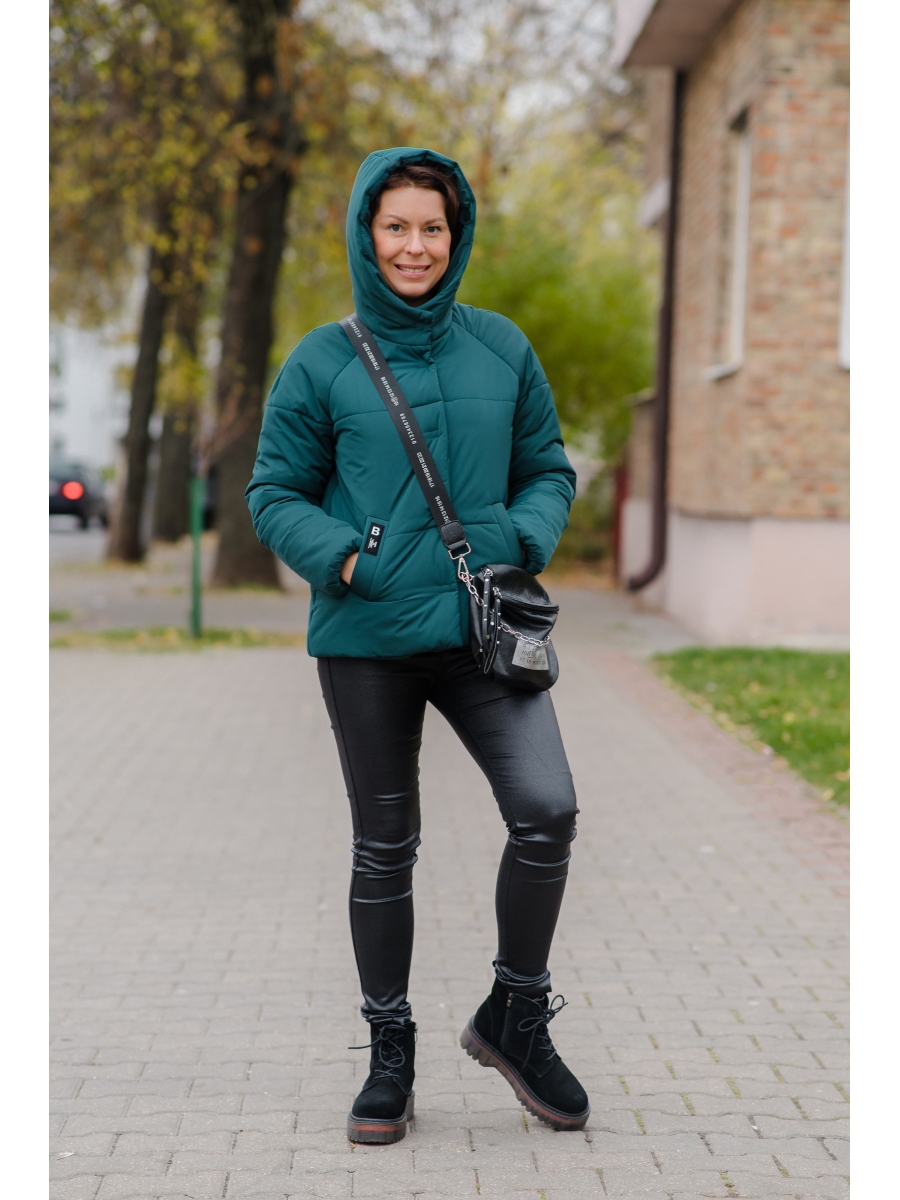 Комфортная женская куртка прямого силуэта с рукавом реглан, по низу рукав чуть присборен. Спереди наклонные карманы "листочки". Один рукав задекорирован отделочной нашивкой. Застежка однобортная на потайные. Горловина оформлена капюшоном, спереди переходящим в стойку. Спинка без особенностей. Куртка на подкладке и на утеплителе HOOPON, выд. температурный режим -15 C.