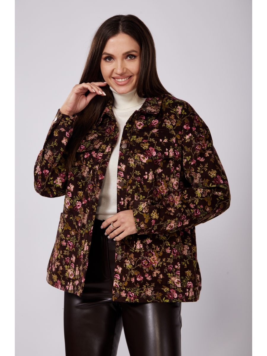 Жакет женский, повседневный из смесовой (вельветовой) ткани. Модель прямого силуэта с внутренней кулисой по линии талии. Застежка центральная на петлю пуговицу. По переду выполнена горизонтальная кокетка, рельефные швы с декоративными клапанами и боковыми накладными карманами. По спинке также горизонтальная кокетка и рельефами. Рукава рубашечного покроя, одношовные с притачной манжетой. Воротник отложной с острыми концами. Низ изделия обработан планкой