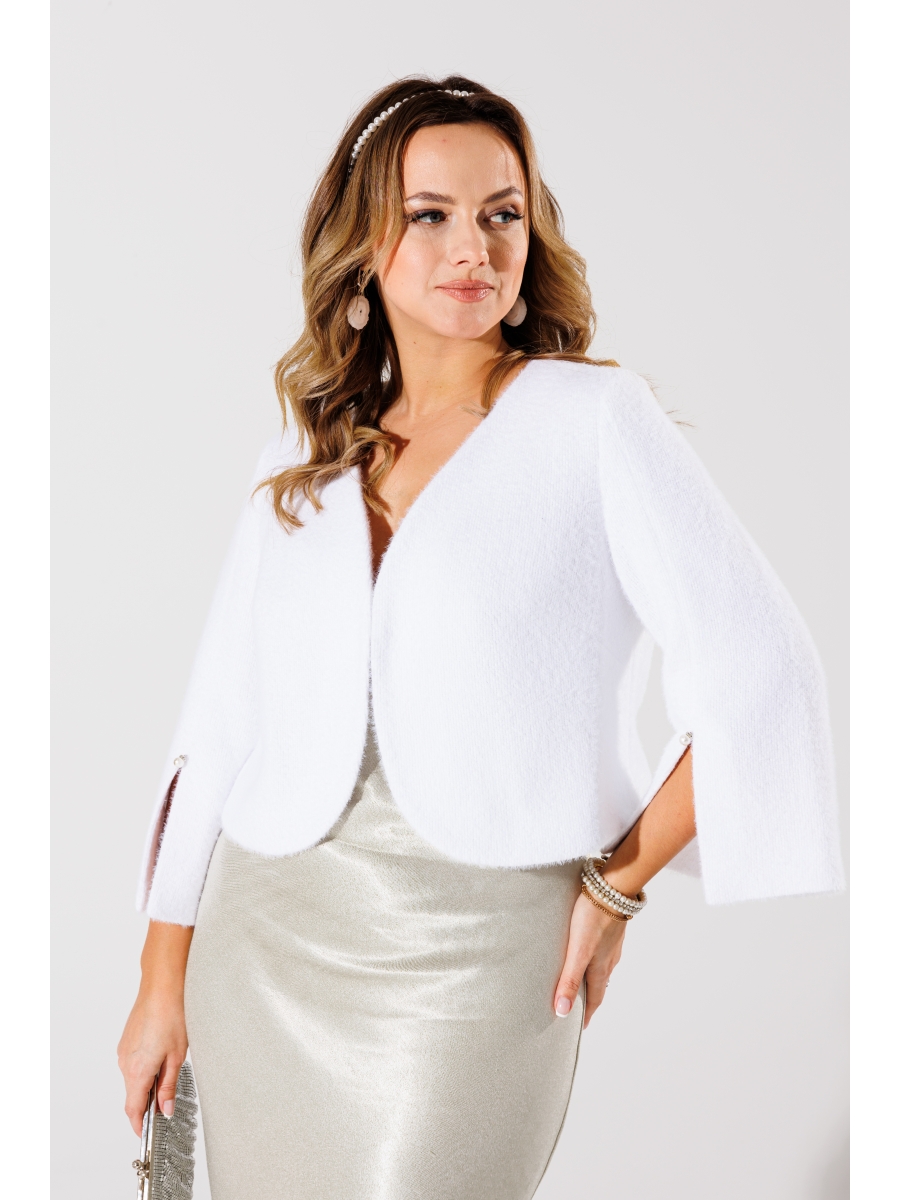Любое платье дополняется прекрасным жакетом, придающим образу изысканный завершающий штрих. Фигурные рукава которого украшены красивыми бусинами, добавляют ему дополнительную изысканность. Благодаря мягкой текстуре и утепляющим свойствам, это болеро не только прекрасно держит форму, но и обеспечивает теплую и комфортную атмосферу в любое время года.