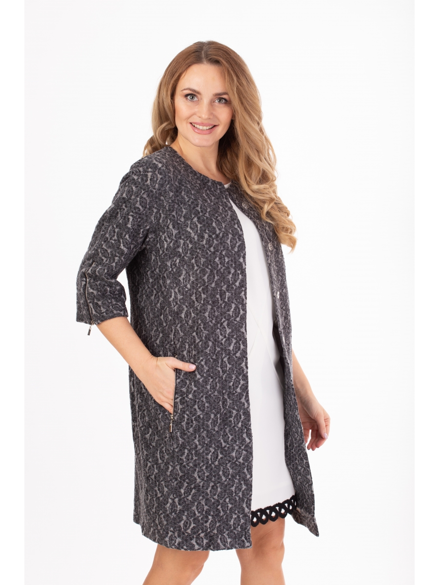 и цельнокроеный 3/4 рукав с подрезом в стиле 60-х, отрезные боковые детали, выполнено из трикотажного полотна, в состав которого входит шерсть. В швах притачивания боковых деталей по переду действующие карманы, застегивающиеся на молнию. Супатная застежка на пуговицы. В верхнем шве рукава снизу молния. Правильная длина - до середины колена.