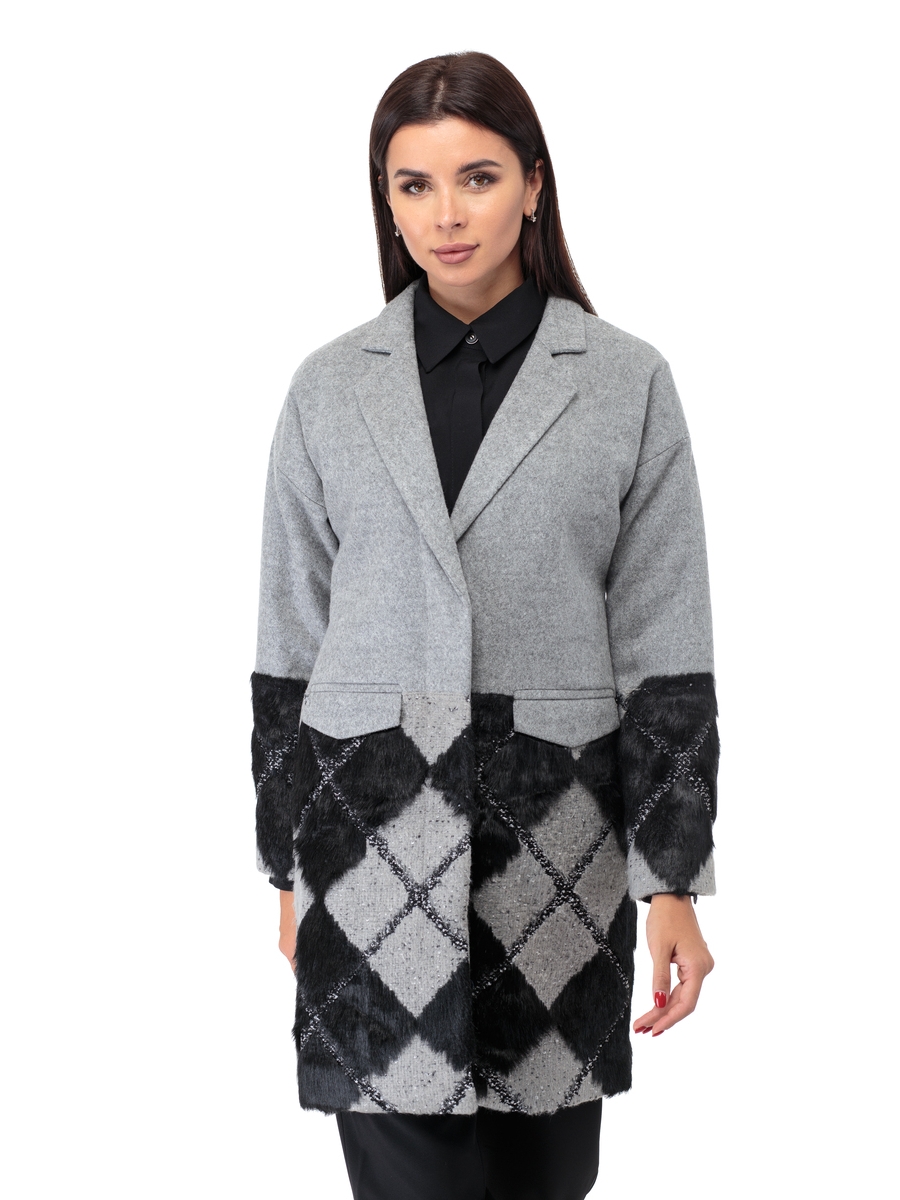 Спущенный рукав с отделкой из ткани-компаньона, отлажной воротник с лацканами, прорезные действующие карманы с клапаном в шве соединения деталей. Супатная (потайная)