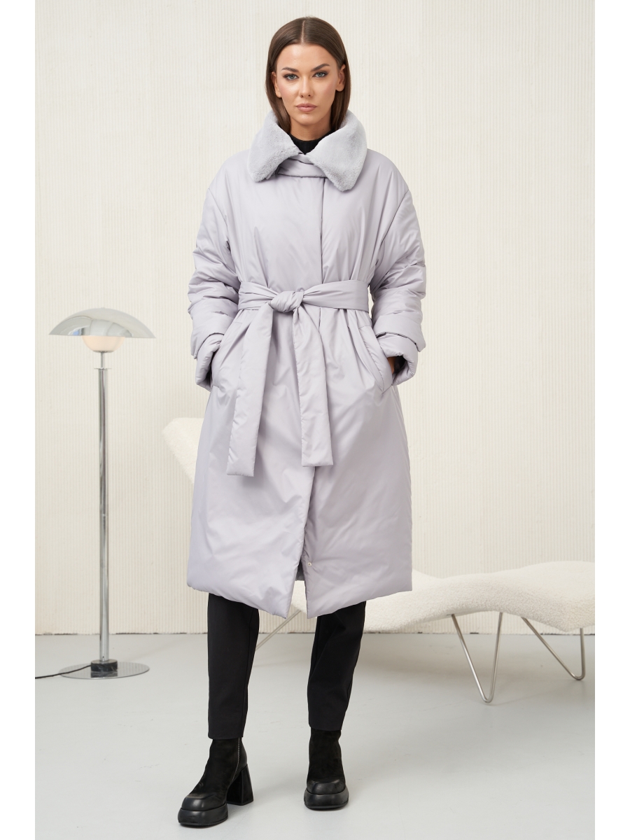 Свободный упрямлённый силуэт со слегка заниженной линией плеча, втачной покрой с расширенным рукавом в области оката. Полочка с прорезными карманами с листочкой, центральной застёжкой на тесьму-молнию и потайные кнопки. Спинка с центральным швом и отрезной кокеткой. Рукав двухшовный с отделочной патой. Воротник стояче-отложной на отрезной стойке с отстёгивающимся отделочным меховым воротником. По горловине застёгивающаяся пата.