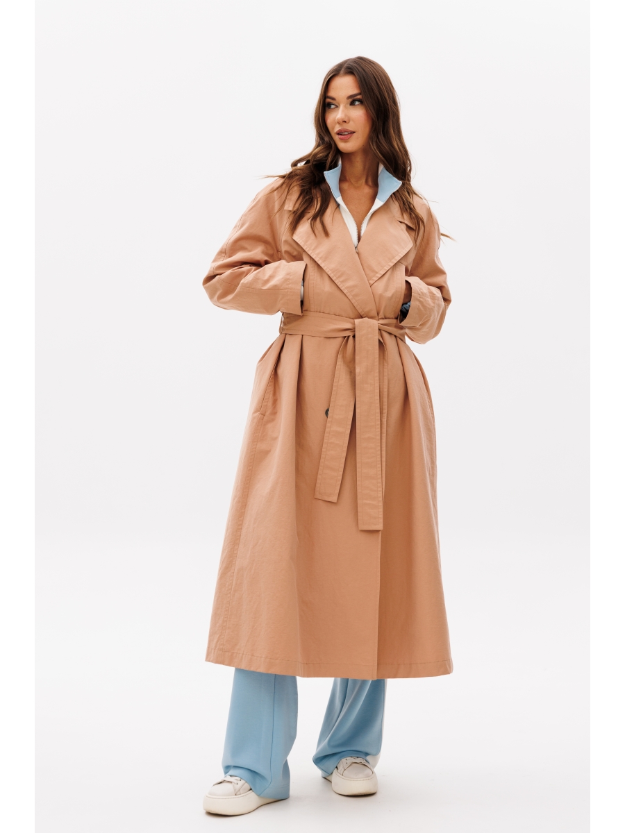 Классический вариант тренча покроя реглан в удлинённом варианте с поясом, отложным расширенным пиджачным воротником, встречной складкой по спинке, подрезом по переду и двубортной застёжкой.