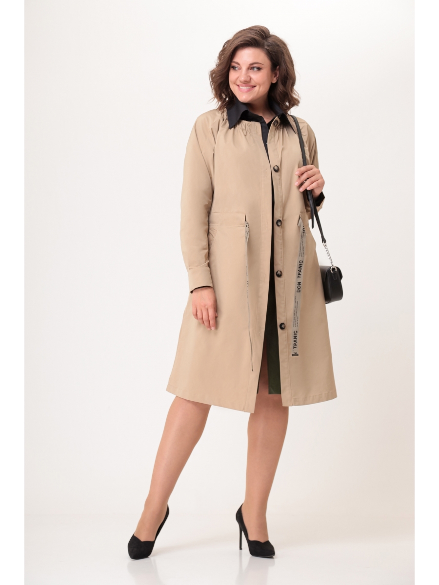 Плащ женский, выполнен из качественной голландской плащевой ткани. Плащ с центральной застёжкой на петли и декоративные пуговицы. Рукав длинный, цельнокроенный с передом. Верхняя часть рукава с подрезом. По низу рукава - складки и манжет. По переду, в области бедер обработаны прорезные карманы с настрачными листочками. Горловина круглая, край окантован. Область горловины декоративно собрана на вингерку. В нижней части боковых швов плаща обработаны разрезы. В верхней и нижней частях спинки расположены складки. По линии талии - настрочная кулиса, в которую вставлена декоративная тесьма.