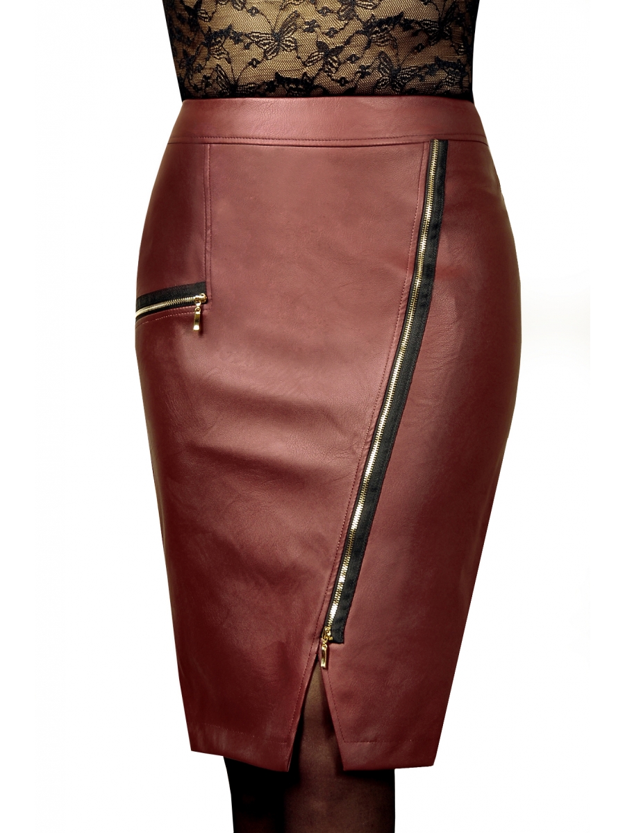 "Юбка-карандаш из экокожи. По спинке молния, шлица. По переднему полотнищу две молнии декоративного характера - 13 см на боковом кармане (карман недействующий) и по диагонали полочки. Юбка на подкладке.