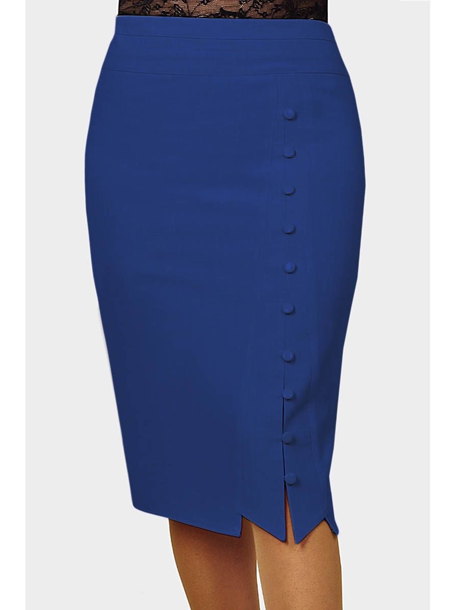 "Юбка на подкладке, по спинке потайная молния и шлица. По передней части вертикальная деталь в виде клина и к ней пришиты пуговицы -8 шт.