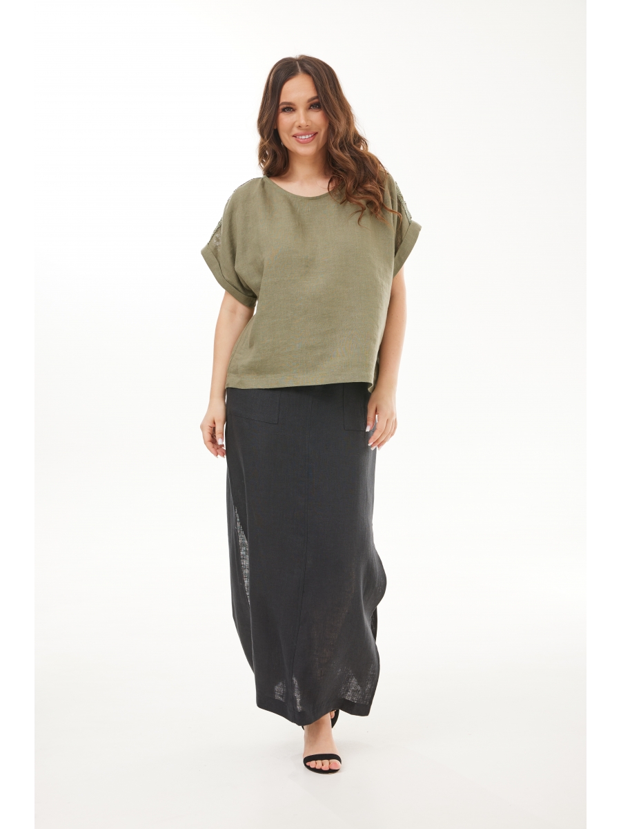 Стильная юбка макси из качественного мягкого льна с эффектом мятости с накладными карманами, с разрезом по бокам украсит разные типы фигуры. Юбка подходит как на работу, так и для прогулок и отдыха. Модель с притачным поясом, в задней части пояса вставлена резинка с застёжкой на тесьму-молнию и пуговицу на поясе. На задней половинке расположены притачные кокетки с клапанами.