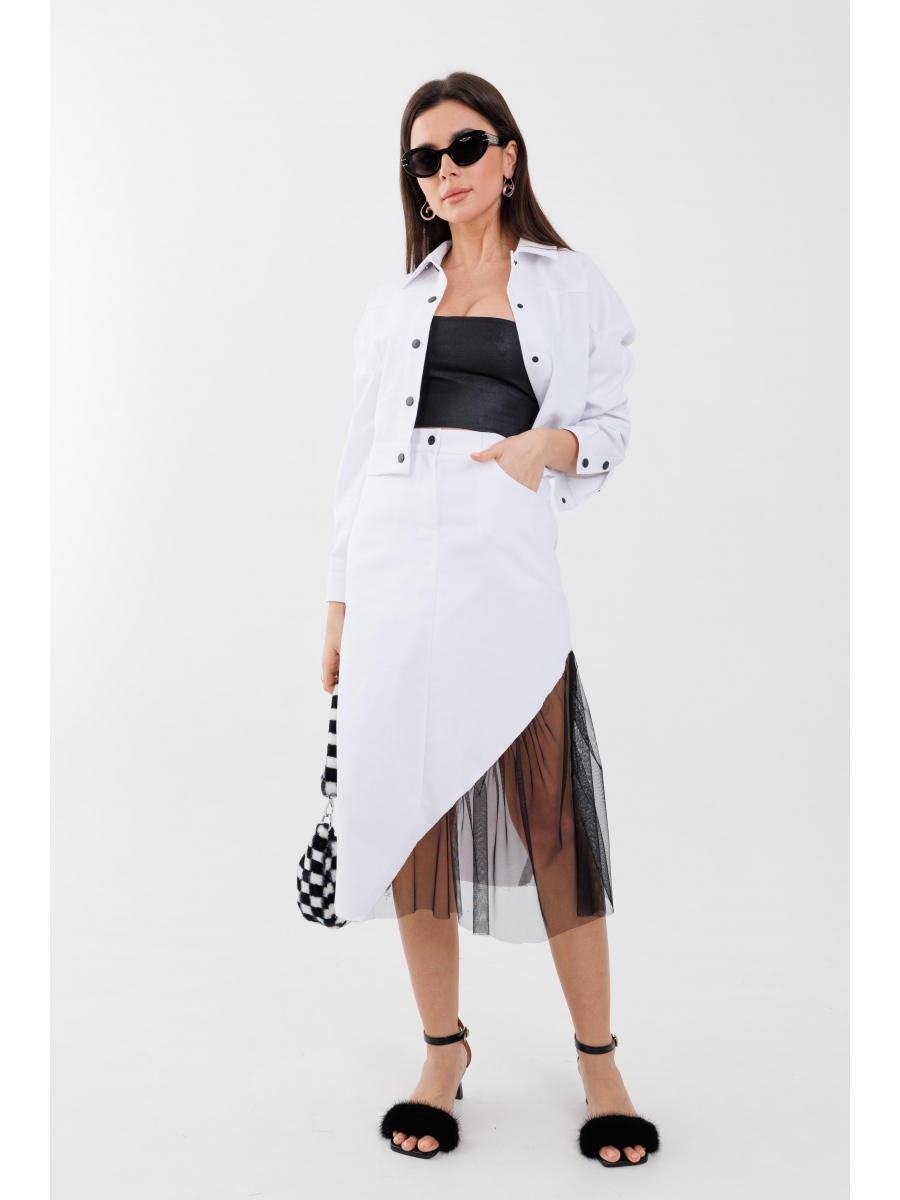 Юбка женская, силуэт трапеция, длина миди. По переду застежка на молнию, пояс на петлю пуговицу, боковые карманы. По спинке накладные карманы. Юбка внизу слева с декоративной вставкой из сетки. Актуальная модель, сочные цвета, хорошая посадка и стильный образ в нынешнем сезоне.