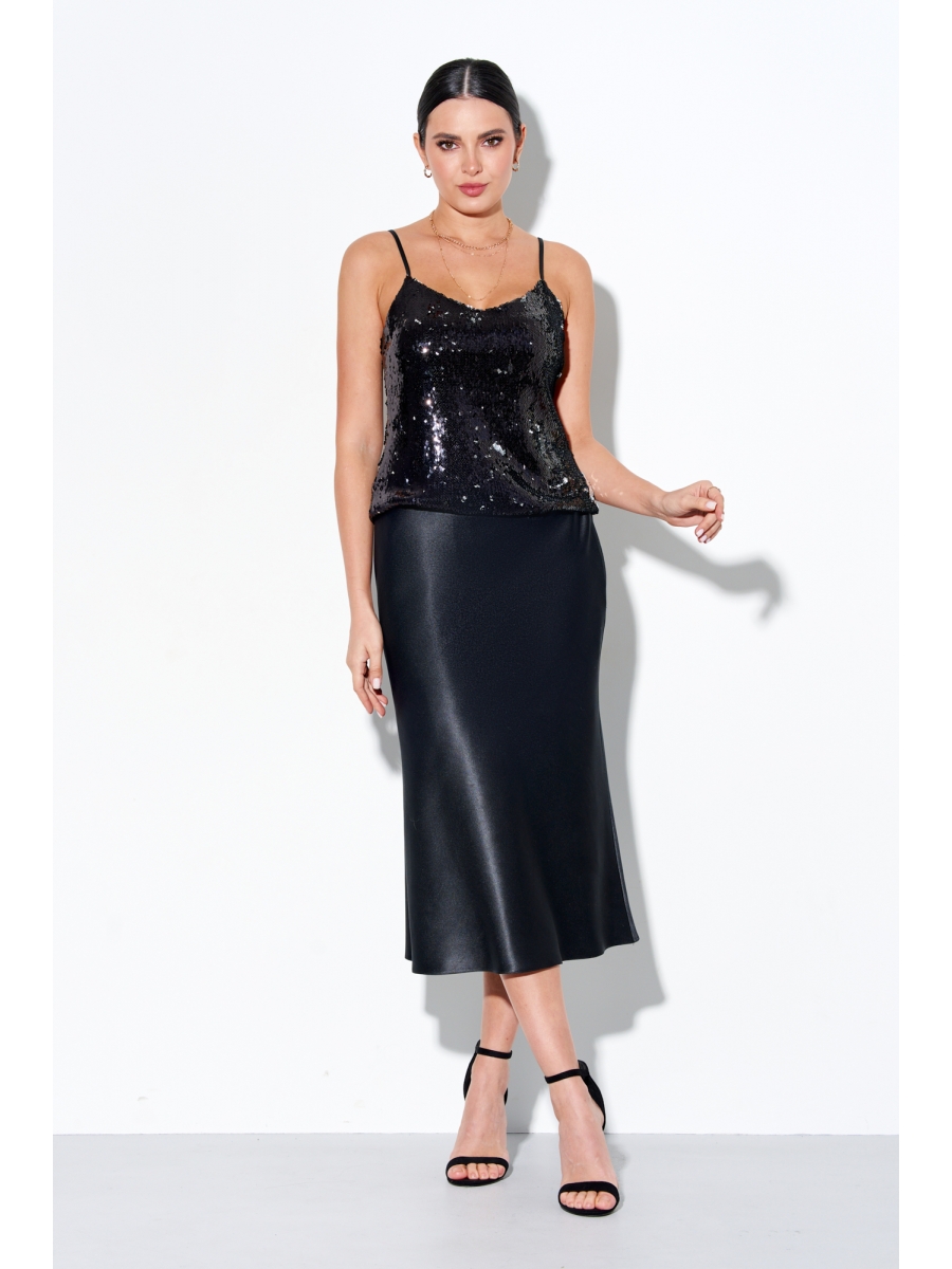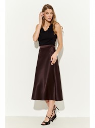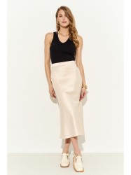 Юбка миди прилегающего силуэта из струящейся сатиновой ткани с добавлением шелка; пояс притачной, в боковые швы которого вставлена резинка для лучшего прилегания; застежка на молнию, петлю и пуговицу.