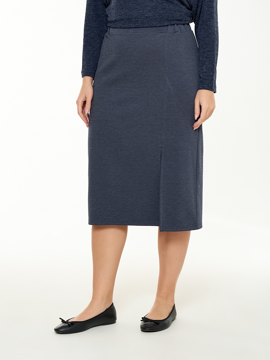 Юбка больших размеров выполнена из плотного приятного на ощупь трикотажного полотна на резинке с разрезом.