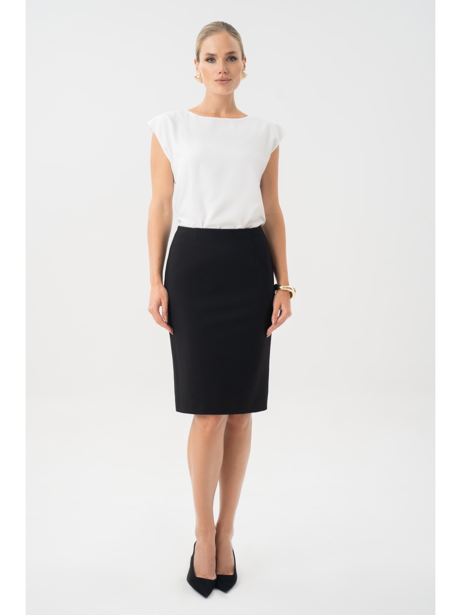 Юбка женская черная URS – это классический элемент базового гардероба, который остается актуальным в любое время года. Юбка прекрасно комбинируется с блузой 24-425-1 и является комплектом к жакету 25-641-1. Юбка женская, зауженная к низу, с посадкой на талии, выполнена из трикотажного полотна, на отлетной по низу подкладке. Юбка предназначена для повседневной носки. Верхний край обработан обтачкой. Переднее полотнище с талиевыми вытачками. Заднее полотнище с талиевыми витачками и средним швом, в верхней части с застежкой на потайную тесьму-молнию, в нижней – со шлицей.