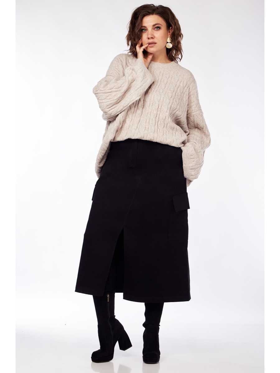 Юбка А-силуэта. На заднем полотнище кокетка и средний шов. Переднее полотнище с фигурным подрезом, разрезом внизу и боковыми карманами. Юбка на поясе, застежка на молнию и пуговицу. На боковых швах обработаны карманы с клапаном