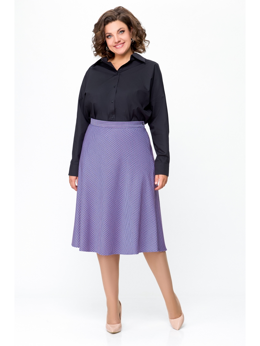 Юбка А-силуэта, длиной “миди”. Юбка выполнена из поливискозной ткани на эластичной подкладке. Перед и спинка юбки цельнокроеные. В боковой шов вставлена потайная молния. Верх юбки обработан притачным поясом, который застёгивается на пробивную петлю и декоративную пуговицу. По центру задней части пояса вставлена эластичная тесьма.