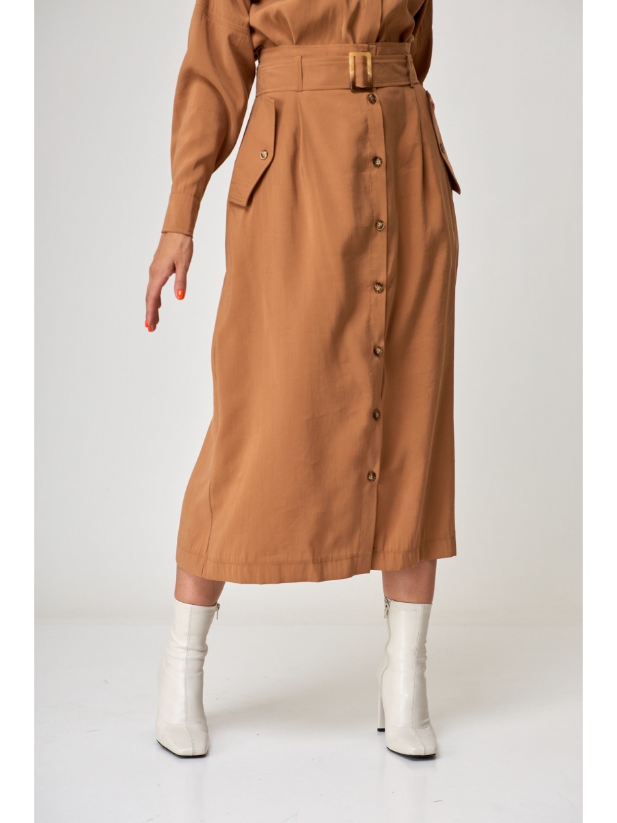 Юбка А-образного силуэта, длины миди, на широком притачном поясе, со шлевками. По переду выполнены боковые карманы с клапанами и функциональная планка на петли и пуговицы. Пояс из основной ткани, с пряжкой.