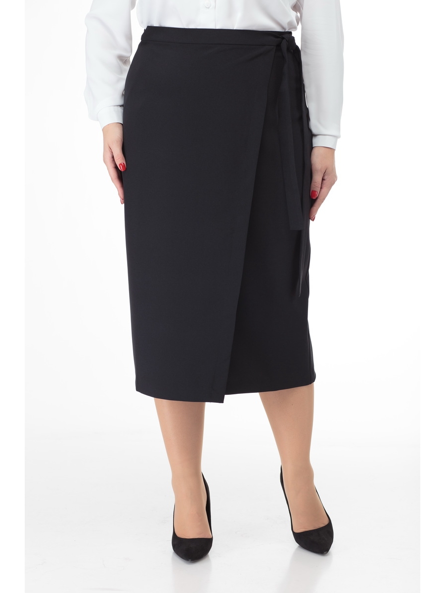 Юбка с элементом запаха, на притачном поясе. Выполнена из костюмной ткани в чёрном цвете, без подкладки. В новейших моделях запах располагается спереди сбоку. Это формирует изящный вырез треугольной формы, который смотрится очень женственно.