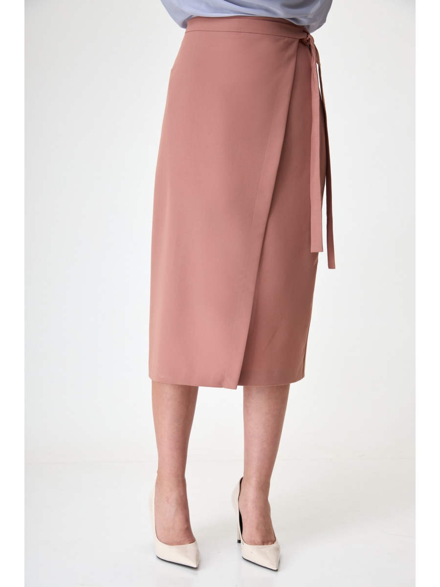 Юбка с элементом запаха, на притачном поясе. Выполнена из костюмной ткани в чёрном цвете, без подкладки. В новейших моделях запах располагается спереди сбоку. Это формирует изящный вырез треугольной формы, который смотрится очень женственно.
