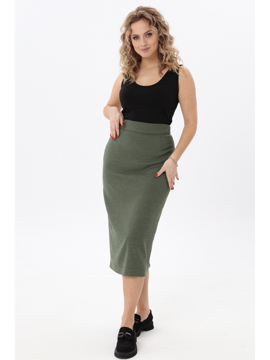 Юбка с высокой посадкой длиной ниже колена, на подкладке. Верх на широком притачном поясе со вставками эластичной тесьмы. Застежка на молнию в среднем шве. На переднем полотнище вытачки, на заднем - вытачки и шлица в среднем шве.