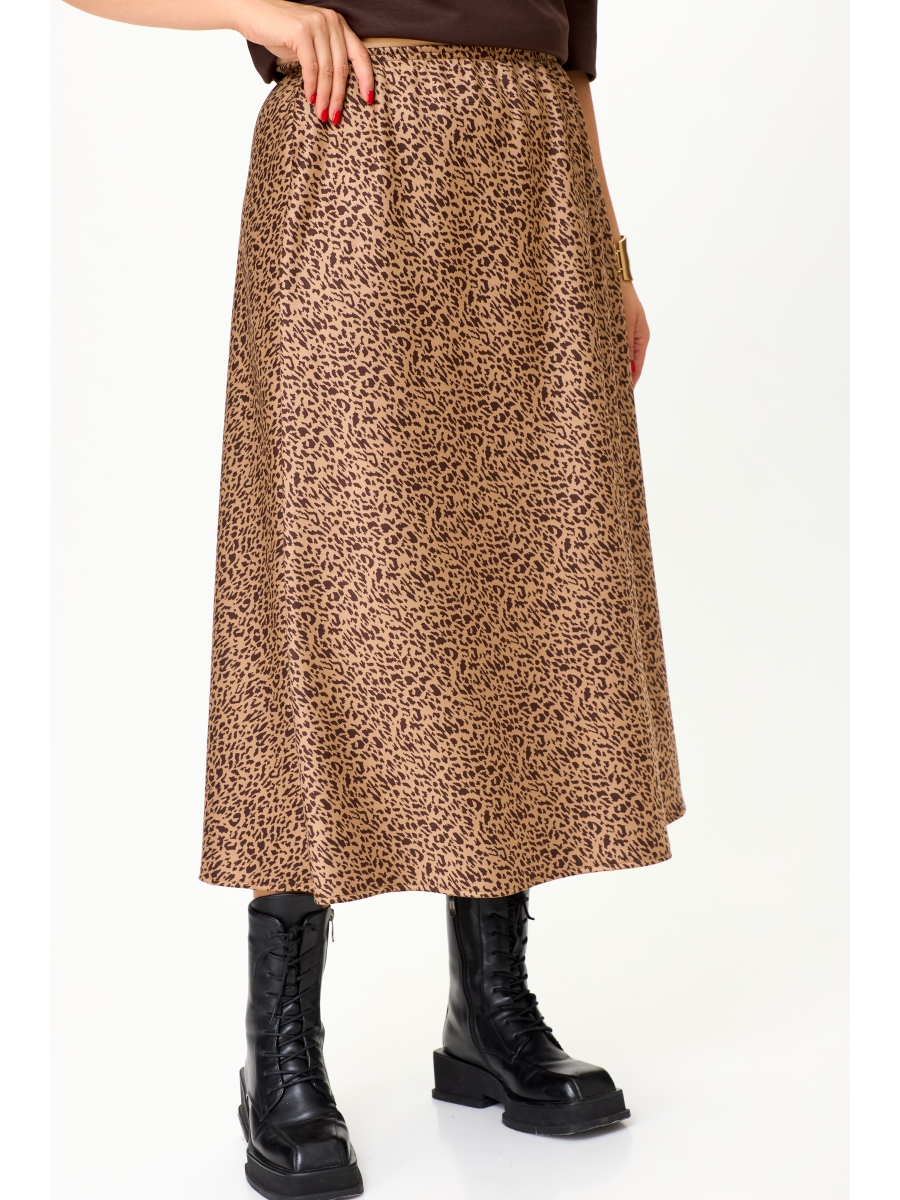Модная юбка длины миди представлена в жаккардовом трикотаже в бежево-шоколадной расцветке с трендовый рисунке «леопард». Юбка свободного кроя, с высокой посадкой, расширена «по косой» от бедер к низу, за счет этого - визуально удлиняет ноги и отлично смотрится на любой фигуре. Юбка на широкой резинке. Она прекрасно подойдет для повседневной носки, так и для работы в офисе. Превосходно будет смотреться с каблуками как вечерний вариант.
