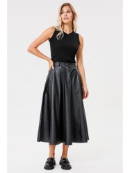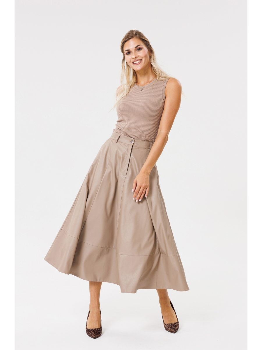 Юбка женская из эко-кожи. Изнаночная сторона эко-кожи: вискозная. Юбка состоит из восьми клиньев. По центру переда расположен гульфик с застежкой. В боковых швах карманы с листочкой. Верх юбки обработан поясом со шлевками.