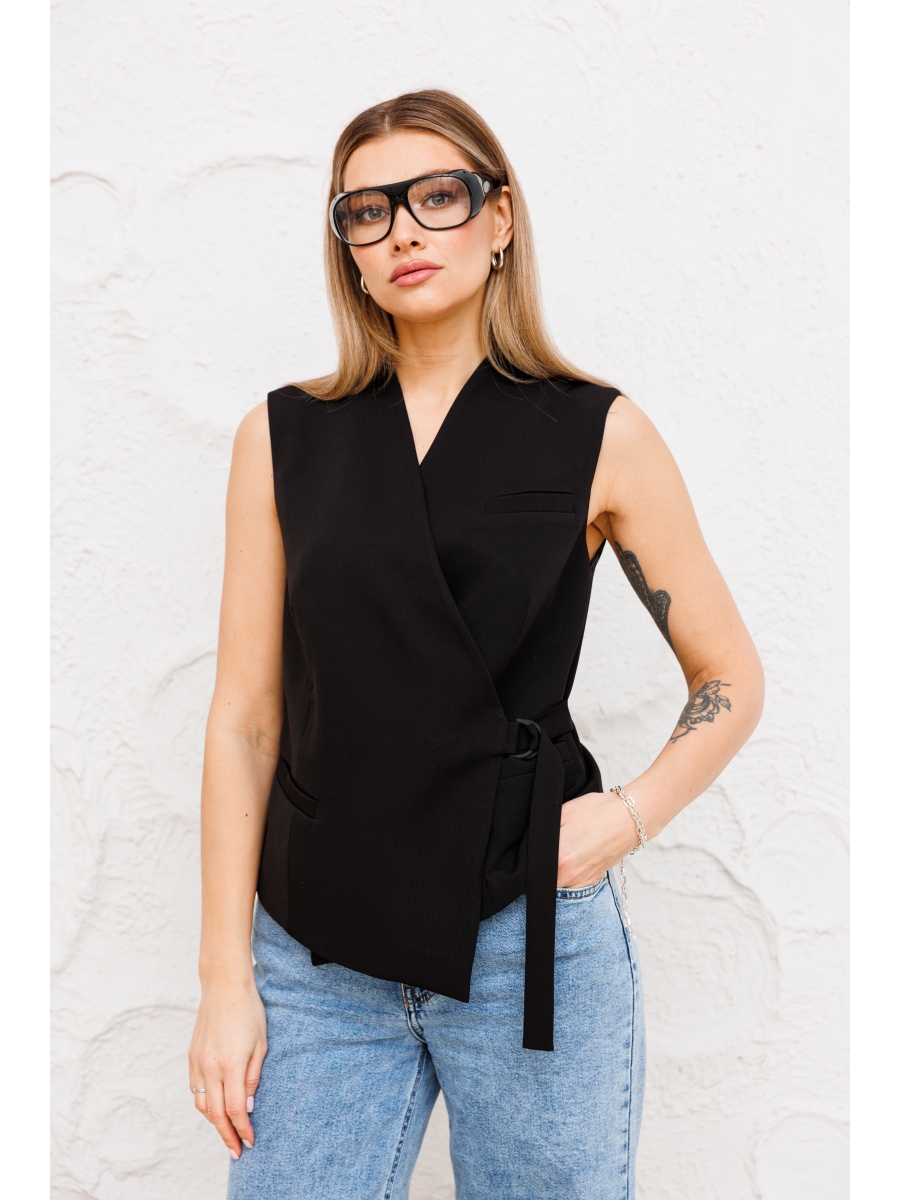 Оформить заказ →Жилет полуприлегающего силуэта на запах с застежкой на пояс из основной ткани,полукольцо и потайную пуговицу. Жилет на подкладке. По переду жилета прорезные карманы с листочкой. Воротник цельнокроенная стойка. Низ спинки прямой. Низ переда фигурный.