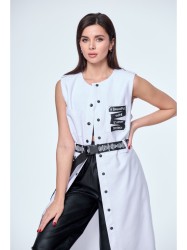 Жилет длинный, с разрезами по боковым швам, застежка по переду на кнопках. Округлая горловина. По спинке кокетка. По переду нагрудные карманы и карманы в боковых швах.