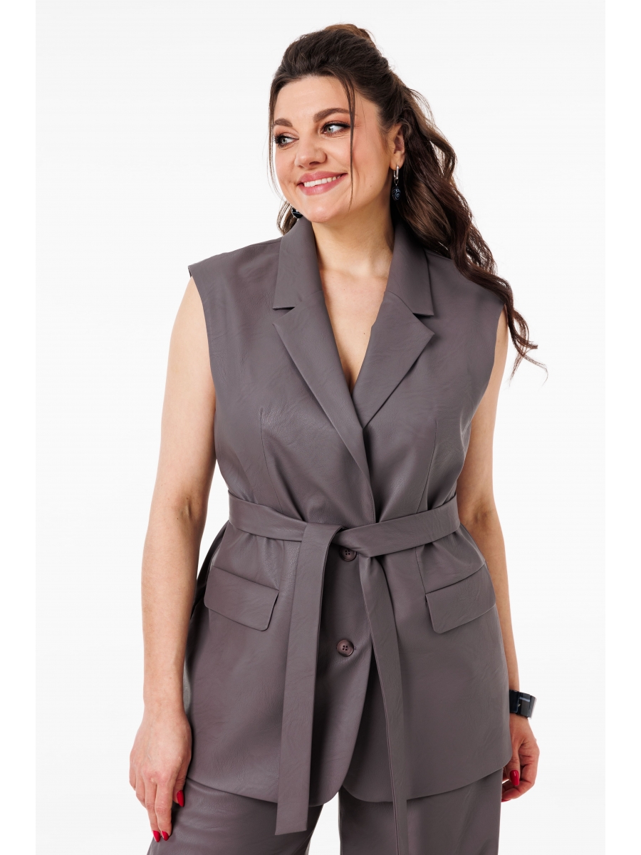 На модели в жилете «цвета акулы» брюки из эко кожи 1400.2, платье из шифона 1504 и белая рубашка 1203.1.