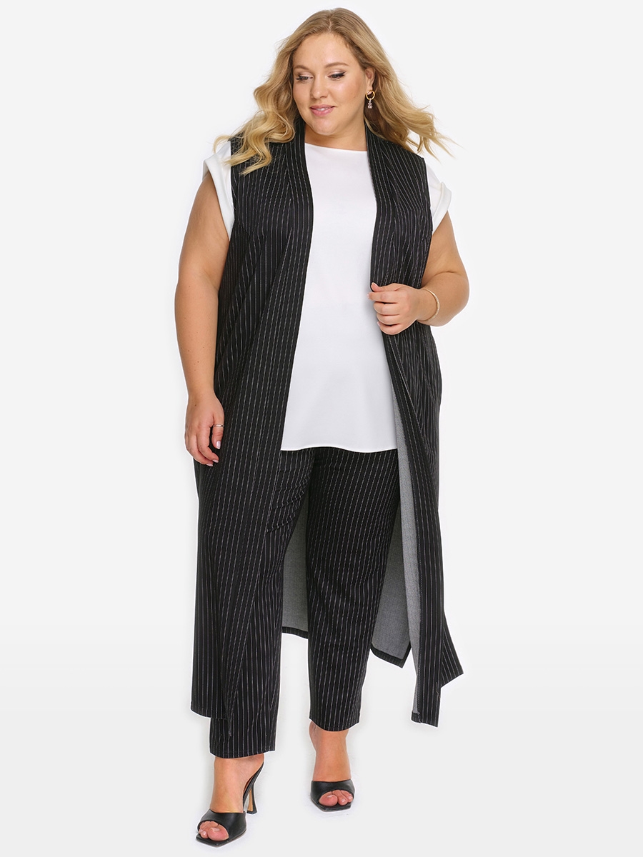 Удлиненный, стильный жилет из плотного черного джерси в полосочку. В боковых швах карманы и разрезы. В нем вам будет комфортно и на прогулках и в офисе.