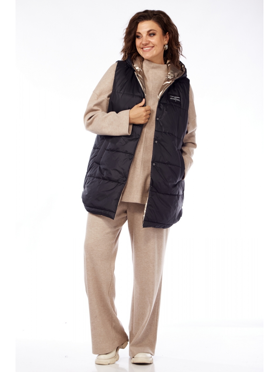 Жилет женский изготовлен из стеганой курточной ткани на синтепоне. Горловина оформлена капюшоном, с кулисой и втянутым шнуром с фиксатором. По переду обработаны карманы с листочками. Спинка цельнокроеная. Застежка на кнопки. Низ в изделии фигурный. В боковых швах по низу обработаны шлицы с кнопками. Декором служит нашивка на левой полочке. Температурный режим до -5.