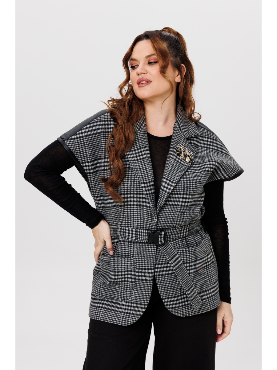 Женский жилет средней длины станет «must have» в гардеробе этого сезона. Сочетает в себе элегантность и функциональность, и подойдет к любому стилю одежды. Можно носить как поверх лонгслива, так и классической рубашки; как с кроссовками, так и на шпильке. Изделие прямого полуприлегающего силуэта с пиджачным воротником (раскладными лацканами). Жилет со спущенным плечом, выполнен из трикотажа с небольшим ворсом по верху, без подкладки, по переду два настрочных кармана, на плечевом поясе вставки из контрастной экокожи. Жилет отлично смотрится как с поясом, так и без него.
