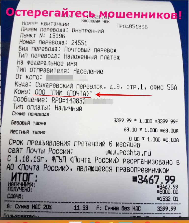 Если всё же Вы уже стали жертвой обмана, то рекомендуем сохранить все данные по заказу - переписки с менеджерами, бланки с почты, чек об оплате наложенного платежа и написать заявления в Полицию, Роспотребнадзор и Прокуратуру по факту совершения преступления.