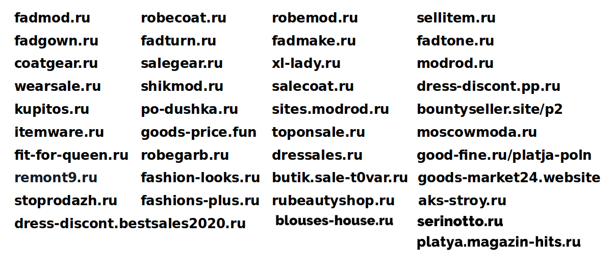 Ниже приведен список сайтов, которые удалось обнаружить на текущий момент времени. НИ В КОЕМ СЛУЧАЕ НЕ СОВЕРШАЙТЕ ПОКУПКИ НА ЭТИХ САЙТАХ!